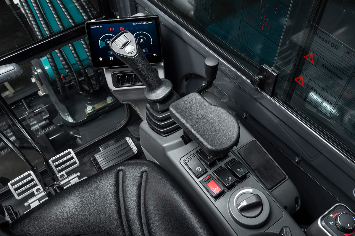 SWE 50UF utmärker sig med sin bekväma och intelligenta hyttdesign, med stötdämpande säten och en 7-tums färgpekskärm för sömlös flödesjustering och kontroll. Den stora undervagnen förbättrar stabiliteten, särskilt i utmanande terränger, medan den höga slagvolymens drivmotor säkerställer enkel rörlighet. Underhållet underlättas med ett helt öppningsbart skydd, vilket ger enkel åtkomst till alla delar.