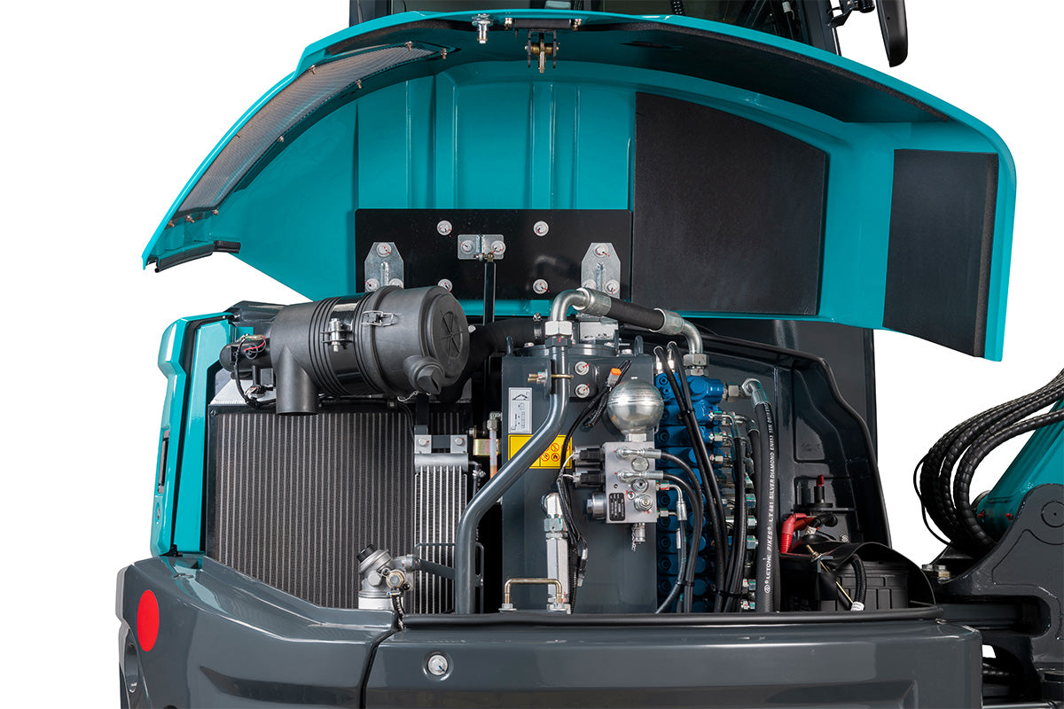 För att minska underhållstiden och kostnaden för SWE 50UF ger kåporna på bak- och sidorna direkt åtkomst till servicepunkterna. De vanliga servicepunkterna – för bränsle-, olje- och luftfilter – nås direkt via kåpan baktill. Med mycket enkel åtkomst till bränsletanken och centraliserade smörjnipplar är dessa minigrävare lika lätta att underhålla som de är att använda.